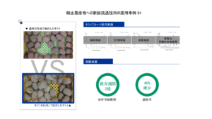 技術番号: 287 登録年度: 2020 〇企業名:(株)オゾンエイド 〇技術名:輸出農産物の新鮮技術 〇技術特徴 オゾンによる鮮度保持技術とIoTモニタリングによる科学的な新鮮流通技術の確保 エチレン分解による老化を遅 […]