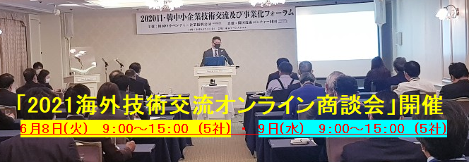 このたび、韓国技術交流の一環として中小・ベンチャー企業の技術交流マーケティング及び輸出販路開拓など日韓における中小・ベンチャー企業の相互発展を目的とした「2021海外技術交流オンライン」を下記のとおり開催いたします。